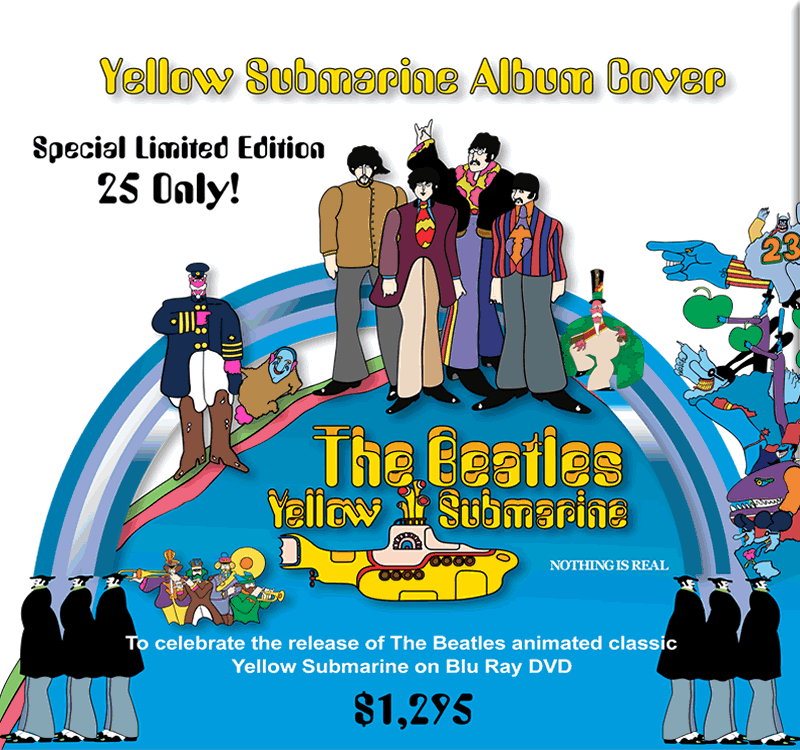 floating-3D effect. Each piece is individually numbered. This edition size is limited to 25 only, in celebrating the Blu Ray DVD release of the Yellow Submarine classic film. All of the same artistic methods are used. Numbered 1/25 - 25/25. As of September 2013 only 12 untis are left. |