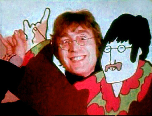 John Lennon poses with his Yellow Submarine cardboard cutout counterpart. 1968