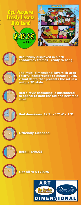 Each 3D Art piece in this series is a fully licensed creative re-interpretation featuring some of the most beloved scenes and characters from the original Yellow Submarine animated classic. The process used takes the familiar two-dimensional images that were created for this groundbreaking film and translates them into 3-Dimensional scenes that are perfect to hang in any room of your home or office and will appreciated by any Beatle fan in your family.